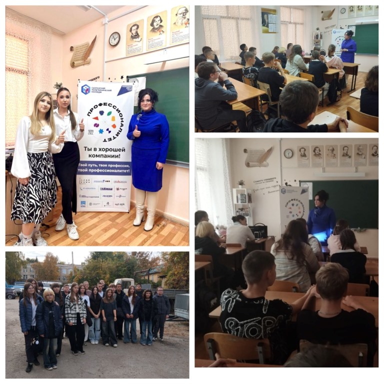 Встреча проходила в формате «Стартовая площадка». Данный формат подразумевает знакомство с профессиональным образовательным учреждением и дискуссионную площадку. Преподаватель колледжа Ольга Сергеевна Долбина и Амбассадоры Профессионалитета провели ребятам классный час, на котором рассказали о направлениях подготовки, студенческой жизни, мерах поддержки студентов, а также о проектах, реализуемых на базе нашего учебного заведения. В рамках встречи для учащихся была проведена экскурсия по учебно-производственным мастерским и лабораториям. Экскурсанты смогли пообщаться со студентами и преподавателями, получили ответы на интересующие их вопросы! Встреча прошла в теплой и дружественной обстановке.